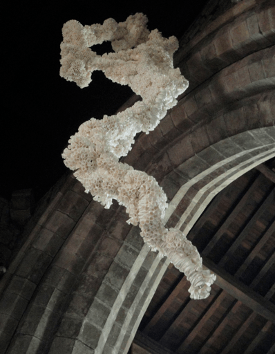 I was very proud to be awarded the curated commission for Wirksworth Arts Festival. The work celebrated the nature of Wirksworth over the centuries of seemingly reinventing itself and today was a thriving creative town. To celebrate this the work was created out of 45,000 balloons and the proportions of the three colours of balloons used referenced the pie chart of the population census figures for 1801, 1901, 2001. The balloons were reinvented - not blown up as would be expected but individually skewed and threaded on steel and impossibly floated in organic forms from the bell tower of St Mary's Church, Wirksworth.