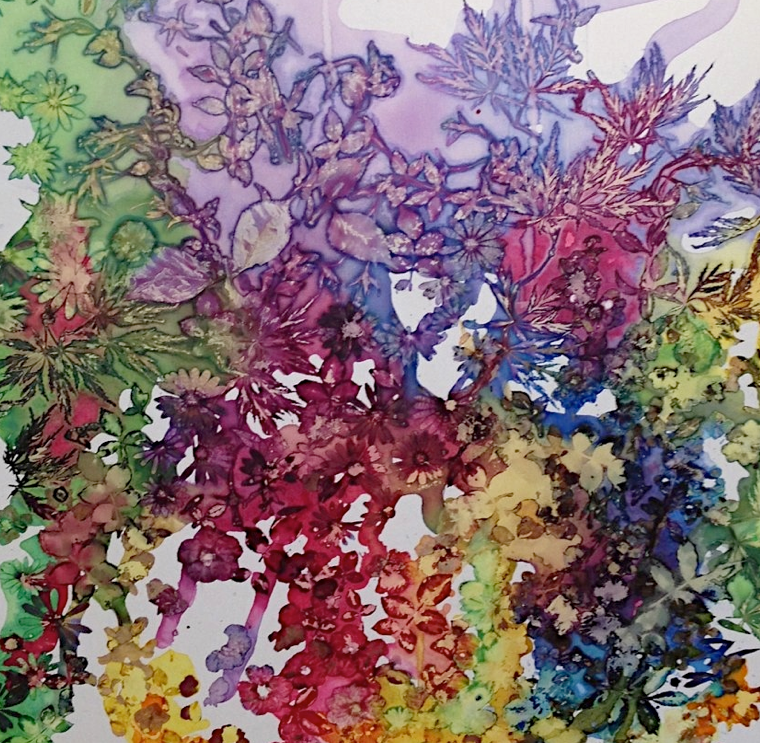 Cerebral Bloom is the name I give to a series of paintings inspired by my mum. My mum was a dressmaker as I grew up, she made ballroom and latin dresses for dancers. My mum had a stroke followed months later by a brain haemorrhage. She survived. But for a couple of years she lost her ability to create. She had always knitted to relax and she couldn't do it anymore. In between her stroke and brain haemorrhage my dad died of bowel cancer 6 months after his diagnosis. My mum and dad had lived in the same house for over 50 years and following my dads death and her recovering slowly from the brain haemorrhage I struggled to think of how she could cope surrounded by memories. I came up with an idea for her to press flowers. She loved her garden. I wanted to think that the search for a beautiful flower to press would give her some distraction and comfort. My mum slowly recovered. Two years later she presented me with the flowers she had pressed. The need for creativity which I share with my mum and was seen so profoundly when she lost her abilities made a big impact on me. Wonderfully my courageous mum recovered her talents and can knit again now.The Cerebral Bloom paintings are created using pressed flowers, inspired by my mum, and painting with permanent ink on canvas, selecting colours intuitively to lead the eye around the canvas capturing the detail by carefully bleeding the ink. The process takes a certainty and decision before applying the ink to the canvas as it can't be undone. I choose bright colours that for me express joy and captures the beauty of the flowers. The layers create movement and depth.