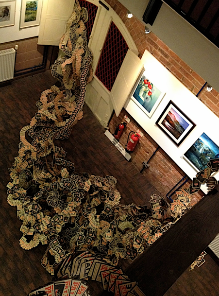 I was invited to create a sculpture for PINT Arts Festival in Burton-upon-Trent. The location of the sculpture was to be at The Brewhouse which is an art centre and theatre in the heart of the town famous for breweries. I proposed to create a sculpture called 'Pub Crawl' out of 100000 beermats. The sculpture was sponsored by Marston's Pedigree who provided the beer mats.