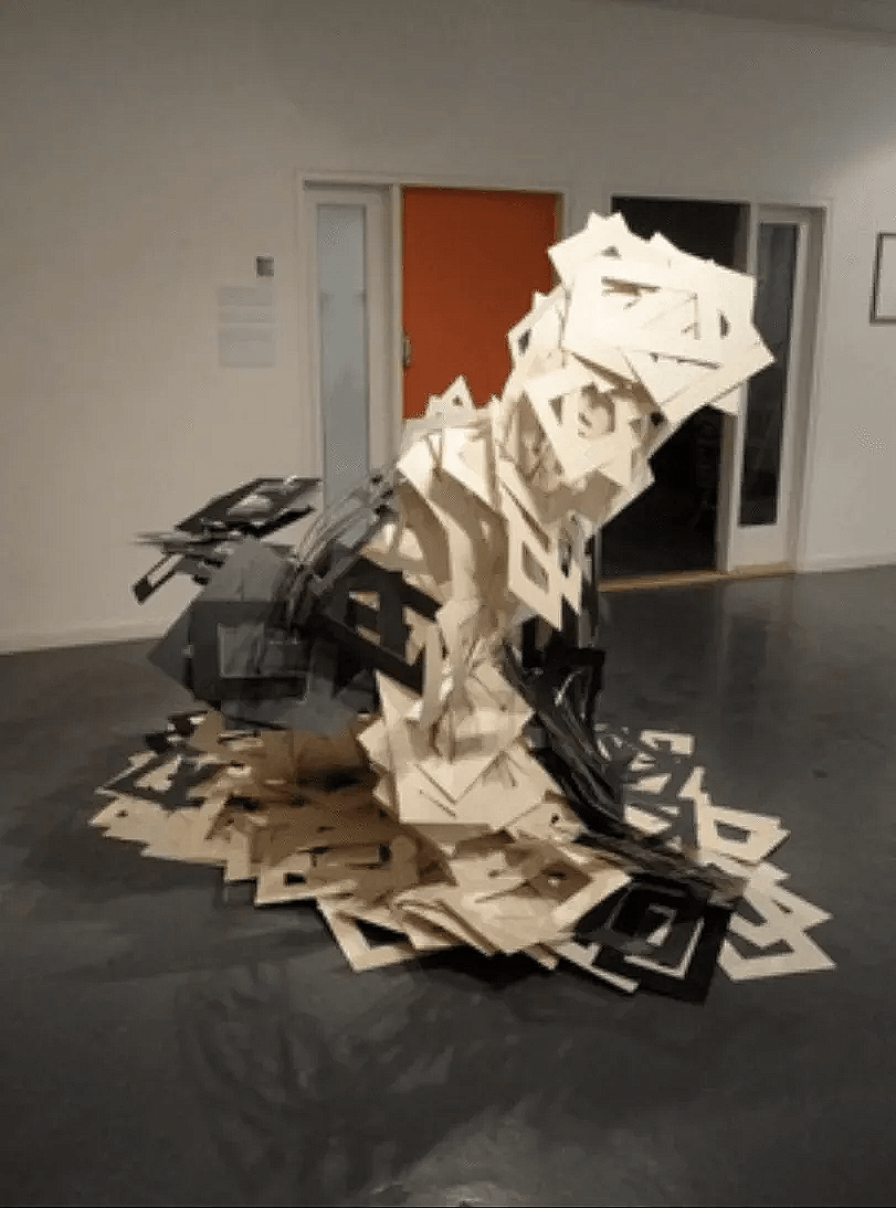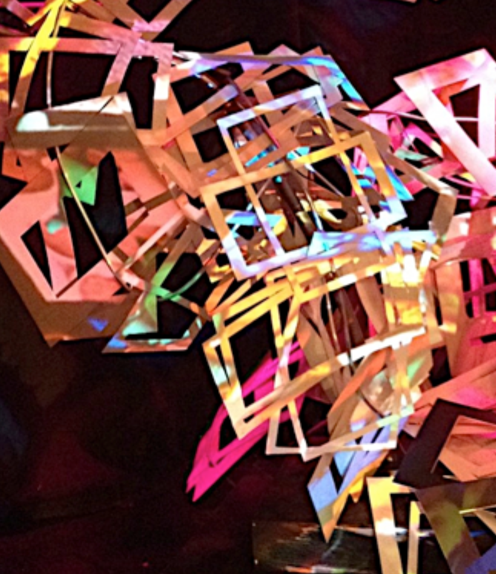 Noticing that I was drawn to reinvent perception of a material by how I used it; that I was drawn to make organic forms that visually travelled and escaped. The link to me is how I felt not working in a creative field for most of my working life. That you can feel like a fish in a bowl - able to swim but stifled. I think that is why I am drawn to make work that escapes.The work below is created by weaving 'mount-board frames' on aluminium forms that creates sculpture that has momentum. The lower pictures are using stained glass collage projected onto the mounts. This work was displayed in a church.